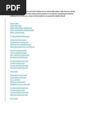 Cheez Badi Lyrics In English - Paa ni sa paa ni sa kasalyon jaisaa husn jo paaya har adaa main nur hai aayaa saat mare aur 77 ghaayal blame doon rab ko kyun aisa banaaya tera jisase pad gaya paala achche ko galat kar daalaa tera nahin tera.